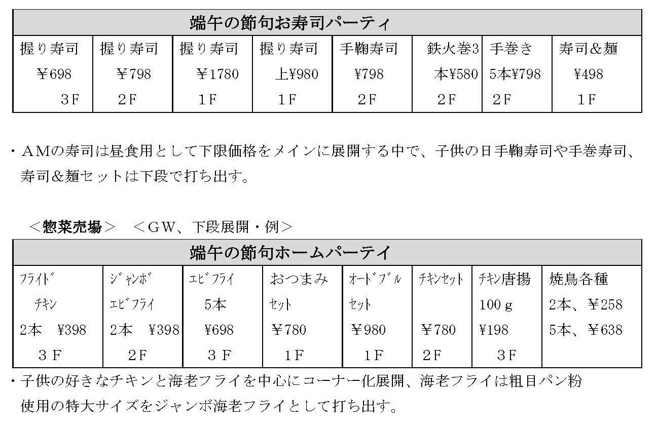 ・端午の節句(5日)は男子を中心に子供全体を対象にした子供の好きなメニュー(海老フライ、 鶏唐揚、フライドチキン)とファミリーで楽しめるご馳走セットメニューを加えて展開する中で、 連休期間中である為、客数を含めて特に盛り上がることは少ない。