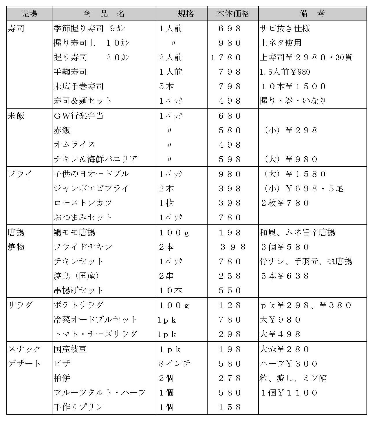 ・連休期間に自宅に残る人達を対象に、昼食用お弁当やお寿司、夕食用としては酒類のおつまみ メニューや寿司の盛合せなどのハレメニューを打ち出す。